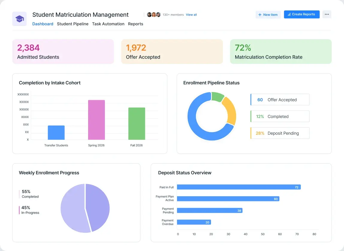Real-Time Analytics Dashboard: Track matriculation completion rates, document submission status, and deposit tracking across cohorts.